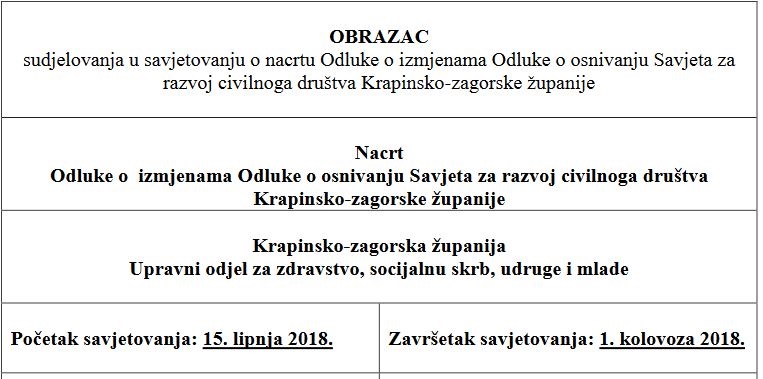Sukladno odredbama Kodeksa savjetovanja sa zainteresiranom javnošću u postupcima donošenja općih akata Krapinsko-zagorske županije, pozivamo zainteresiranu javnost – građane, organizacije civilnoga društva, građanske inicijative, zaklade, te sve zainteresirane koji svojim prijedlozima i sugestijama mogu pridonijeti donošenju kvalitetne i provedive Odluke o izmjenama Odluke o izmjenama Odluke o osnivanju Savjeta za razvoj civilnog društva Krapinsko-zagorske županije da se odazovu i daju svoj doprinos oblikovanju ovog važnog dokumenta. Svoja mišljenja i očitovanja možete u pisanom obliku na propisanom obrascu poslati na adresu Krapinsko-zagorska županija, Upravni odjel za zdravstvo, socijalnu skrb, udruge i mlade, Magistratska 1, Krapina, te na adresu elektronske pošte: zdravstvo@kzz.hr, zaključno do 1. kolovoza 2018. godine.