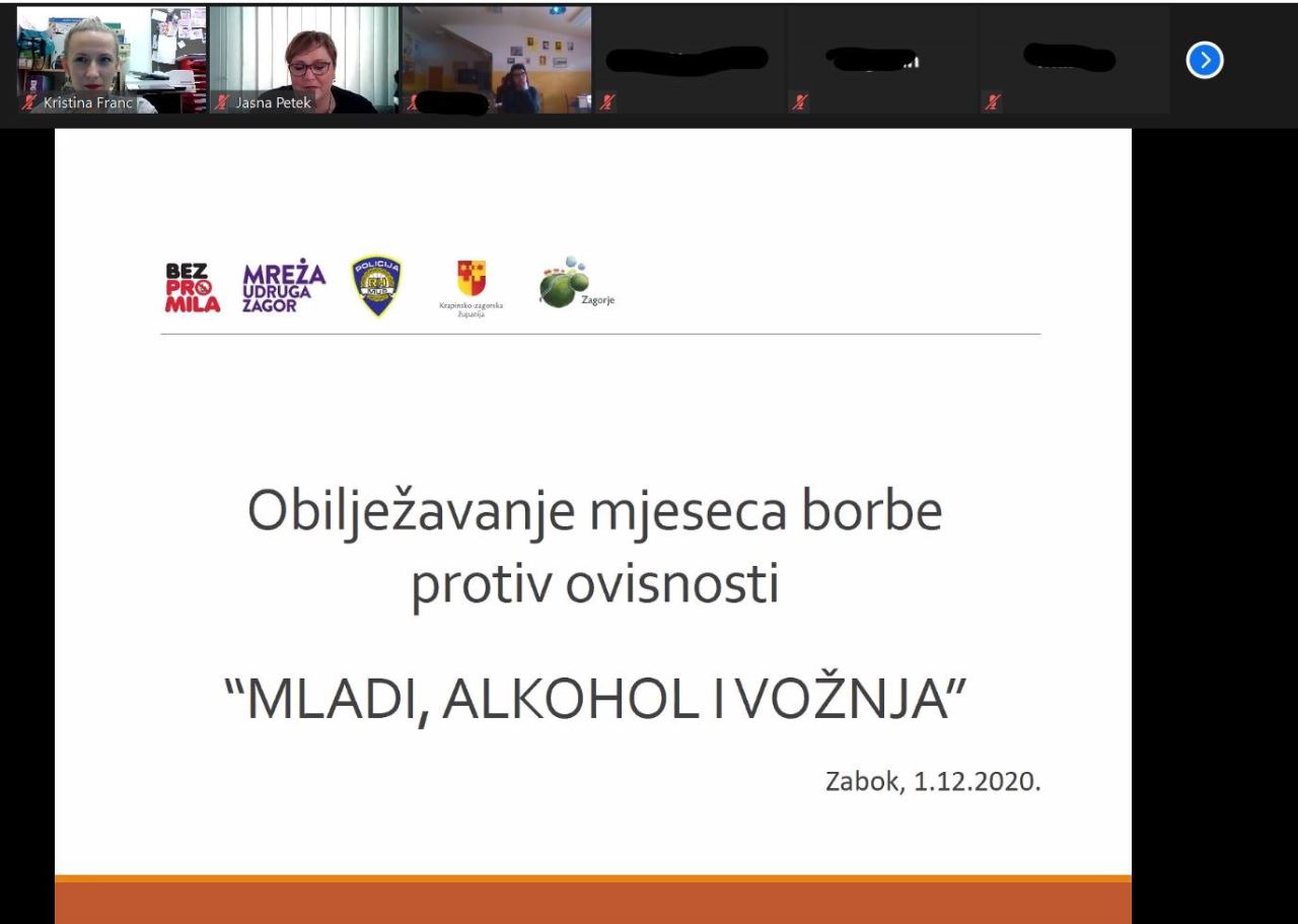 U sklopu obilježavanja Mjeseca borbe protiv ovisnosti, u utorak 1. prosinca 2020., održana je online konferencija „Mladi, alkohol i vožnja“ za učenike/ce Srednje škole Krapina.