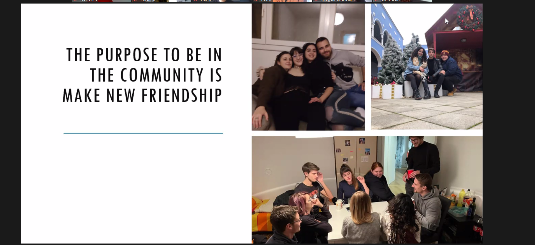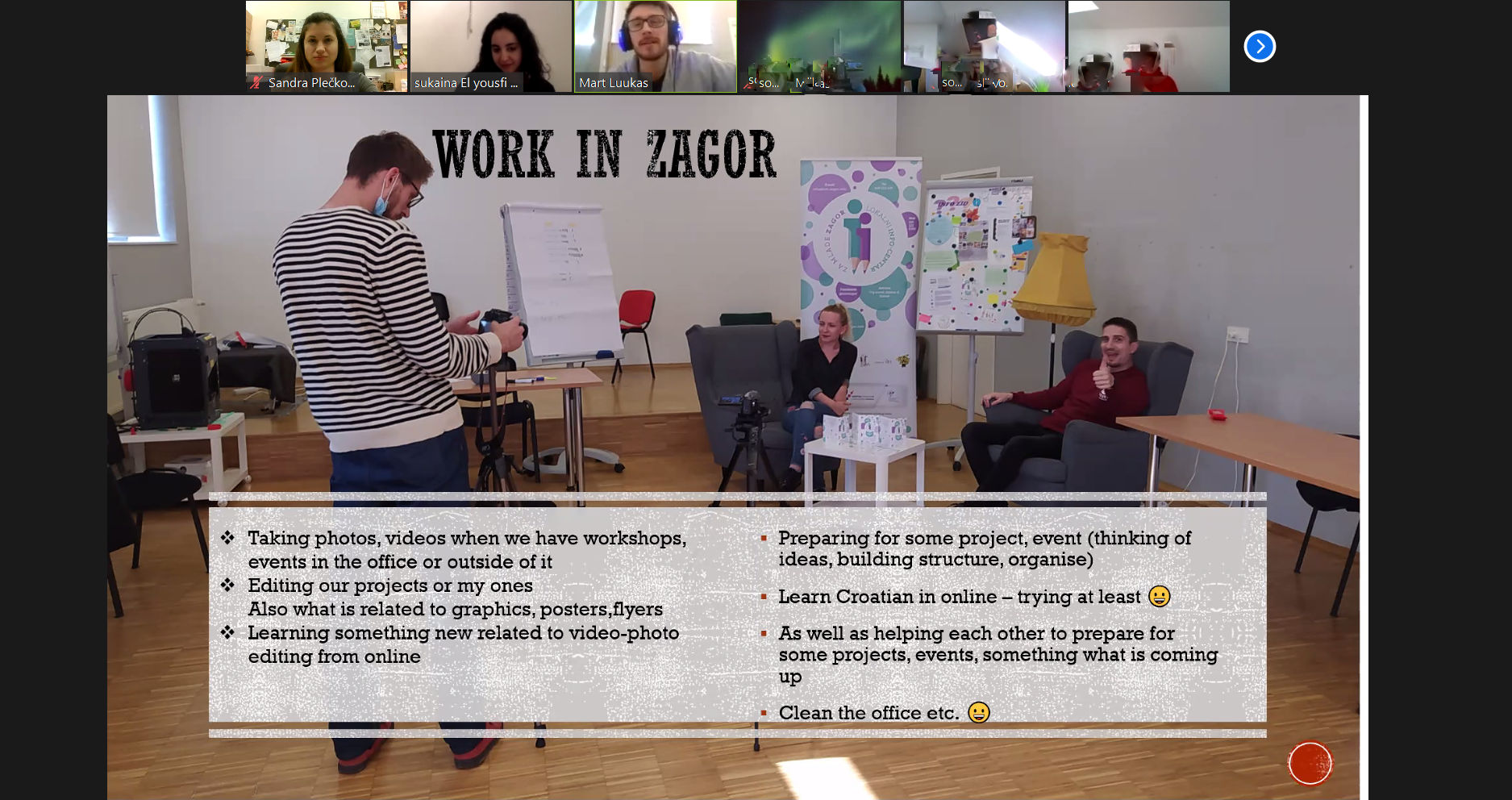 Danas je održano online predavanje za učenike/ce Srednje škole Oroslavje o Europskim snagama solidarnosti te o iskustvima međunarodnih volontera/ki. Mladima su se predstavili naši međunarodni volonteri, Sukaina iz Španjolske i Mart iz Estonije koji su im ispričali o svojem iskustvu s međunarodnim volontiranjem, a mladi su ih imali priliku pitati sve što ih zanima. ESS volonteri obavljaju volontersku službu na godinu dana u okviru projekta "Dva volontera za lokalnu zajednicu 2.0" koji je financiran kroz Europske snage solidarnosti.