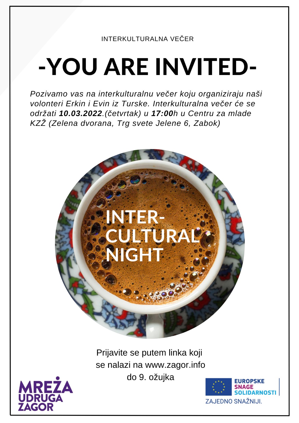 Pozivamo vas na interkulturalnu večer koju organiziraju naši ESS volonteri Erkin i Evin iz Turske. Interkulturalna večer će se održati 10.03.2022.(četvrtak) u 17:00 h u Centru za mlade KZŽ (Zelena dvorana, Trg svete Jelene 6, Zabok).