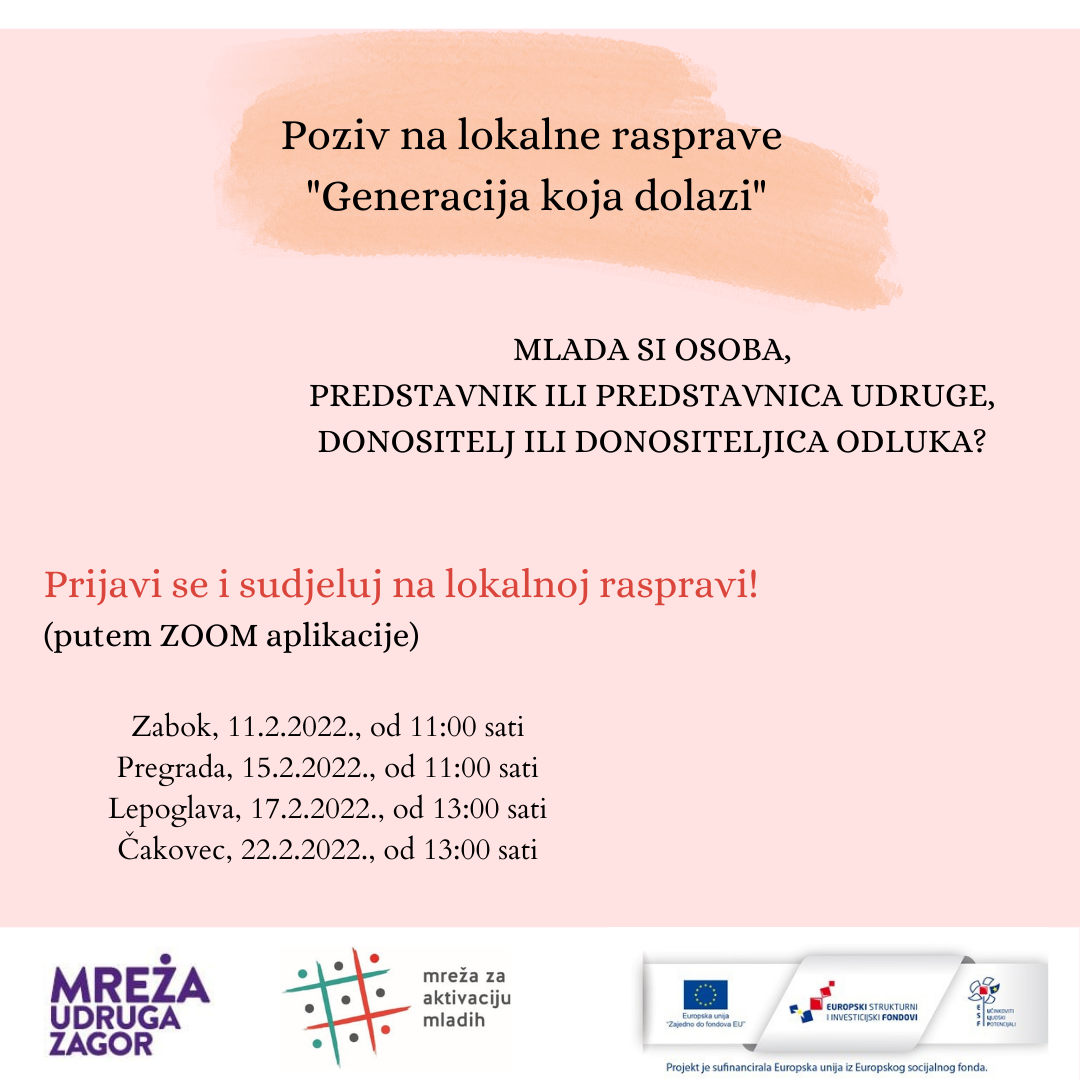 pozivamo Vas na sudjelovanje na lokalnim raspravama putem ZOOM platforme u okviru projekta Mreža za aktivaciju mladih koje će se održati za sudionike i sudionice s područja: