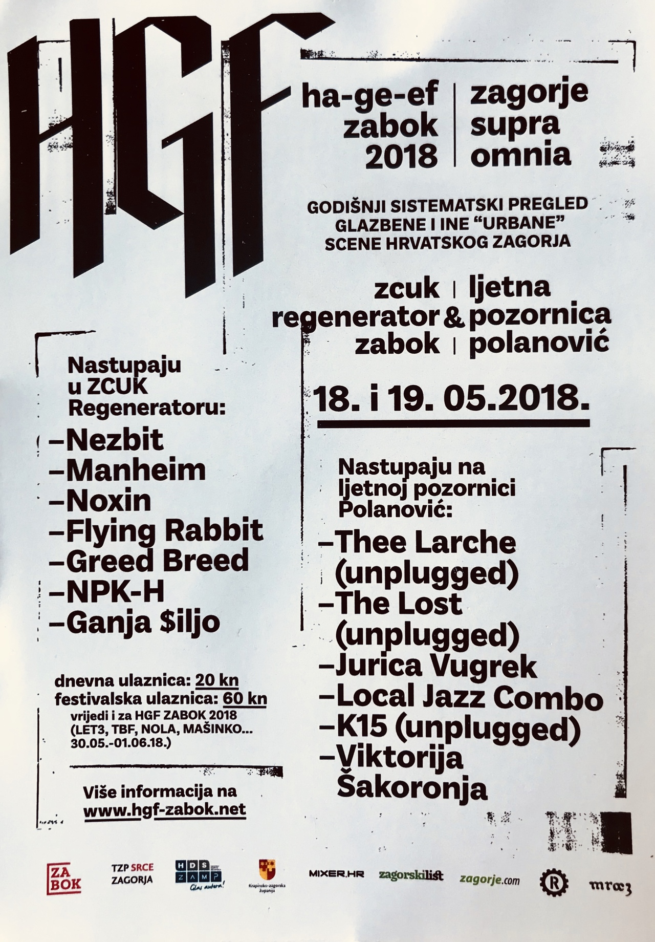 Ovo predstavljanje održava se u sklopu dvodnevnog glazbenog festivala Ha|Ge|eF Zagorje supra omnia 2018 + Zadruga. Glazbeni program odvijat će se paralelno na dvije lokacije- u ZCUK Regeneratoru i Ljetnoj pozornici Polanović u Zaboku, a nastavit će se u subotu 19. svibnja. Nastupit će: