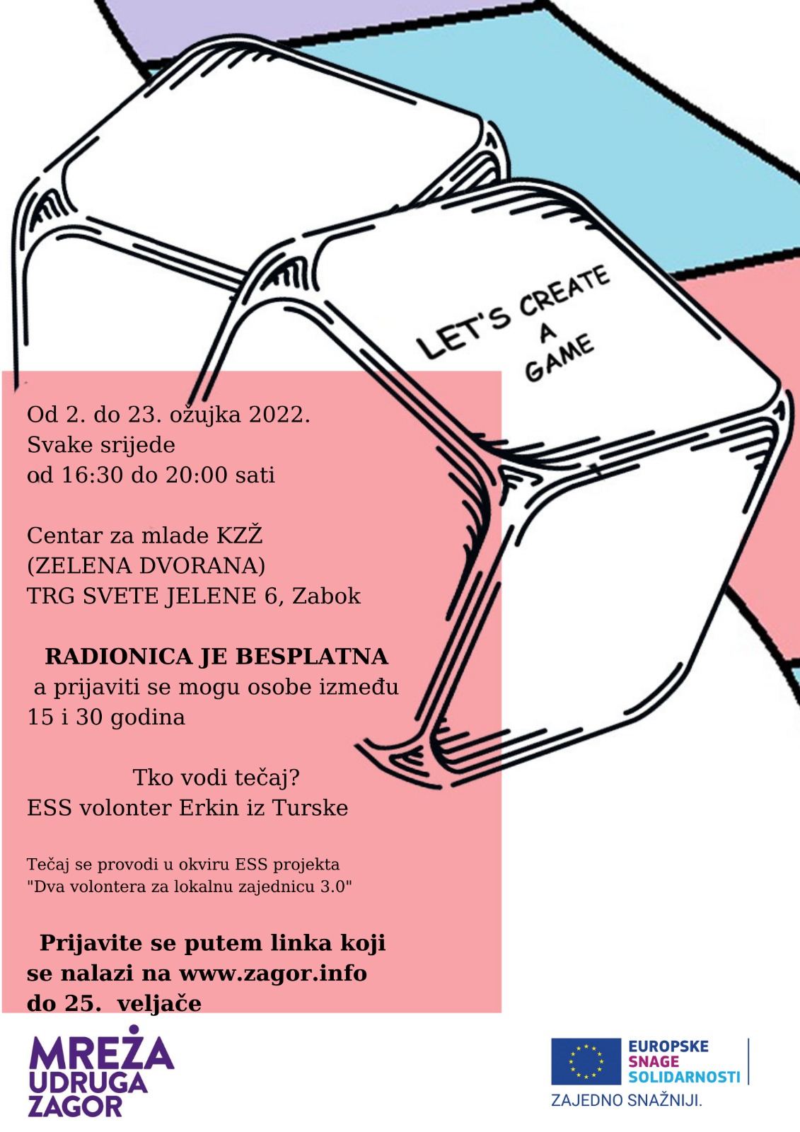 Od 2. do 23. ožujka 2022. svake srijede od 16:30 do 20.00 održavat će se radionica “Let’s Create a Game’’. Na radionici “Let’s Create a game” naučit ćete o igrama na ploči, kako se dizajniraju i kako se kreiraju pravila igre. Imat ćete priliku dizajnirati svoju igru na ploči.