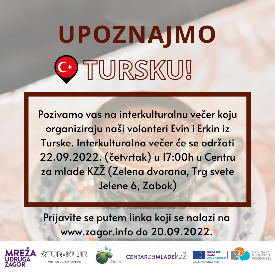 Pozivamo vas na interkulturalnu večer koju organiziraju naši ESS volonteri Evin i Erkin iz Turske. Interkulturalna večer će se održati 22.09.2022. (četvrtak) u 17:00h u Centru za mlade KZŽ (Zelena dvorana, Trg svete Jelene 6, Zabok). Dođite i saznajte zanimljive stvari o Turskoj, okusite izvornu tursku kavu i probajte turske delicije :)