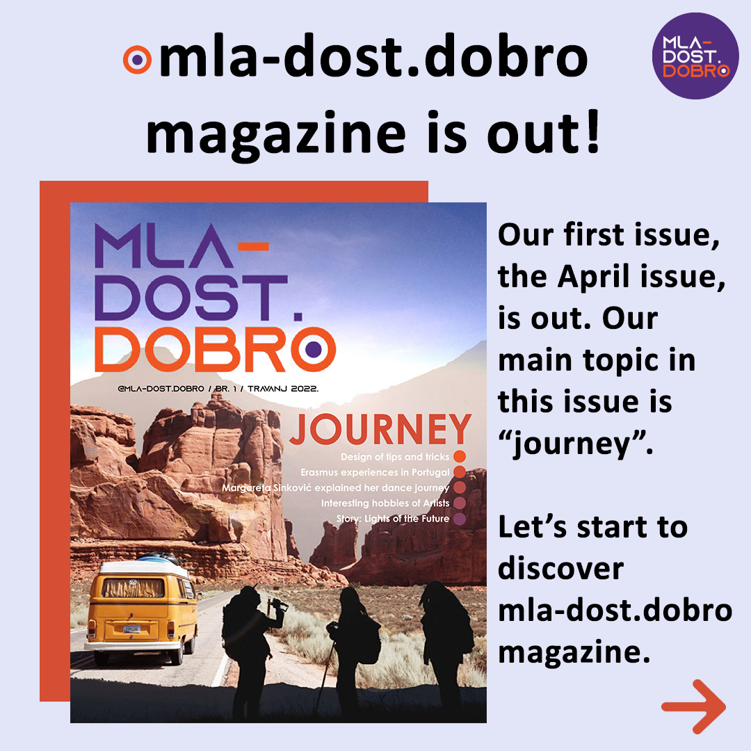 Od danas možete pročitati puno sjajnih članaka u jubilarnom prvom izdanju časopisa! Grafička dizajnerica Marija Gebert napisala je savjete za dizajn u raznim programima. Erkin Duman napisao je vrlo fascinantnu priču pod nazivom „Lights of the future“. Paula Petrinec ispričala nam je svoja Erasmus+ iskustva u vrijeme Covida, dok nam je Gabrijela Rogan ispričala priču o zanimljivim hobijima umjetnika. Profesionalna plesačica Margareta Sinković ispričala je svoj plesni put našoj volonterki Evin Arslan, a Katarina Horvat nacrtala je ilustraciju za Dan planeta Zemlje.