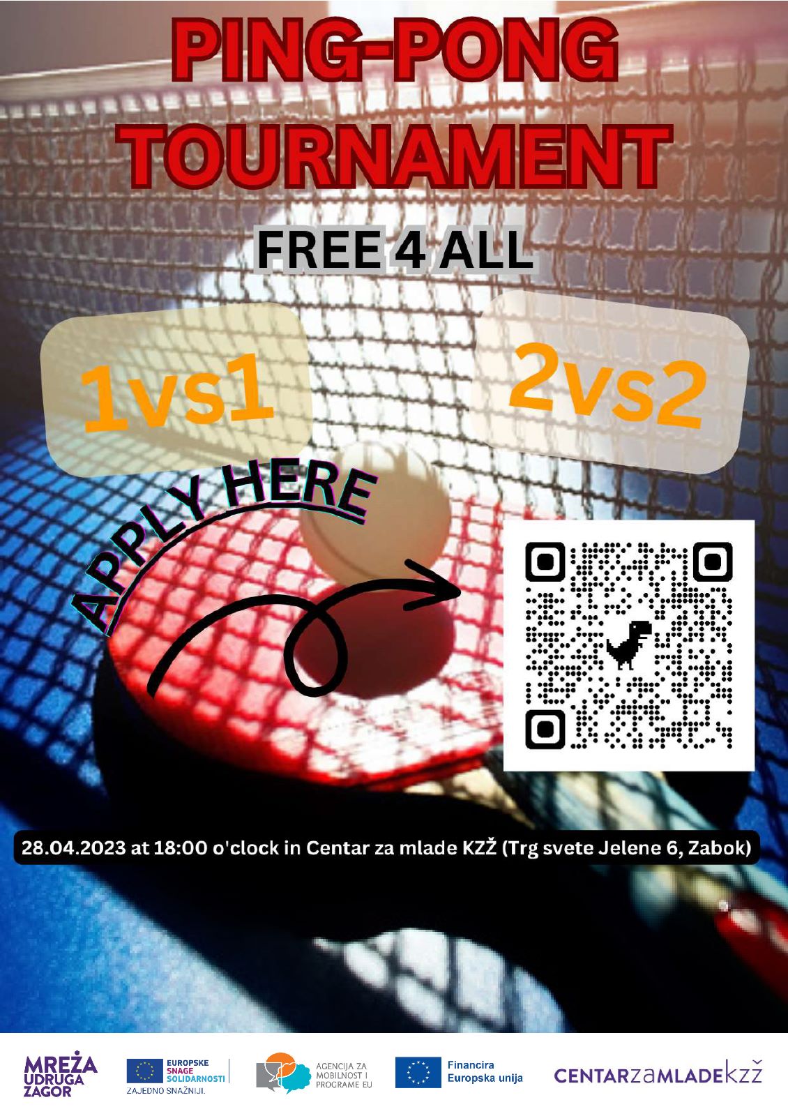 Voliš igrati stolni tenis? Zagorov ESS volonter Jura organizira turnir u stolnom tenisu 28.4.2023. u 18:00 sati, Centar za mlade KZŽ.