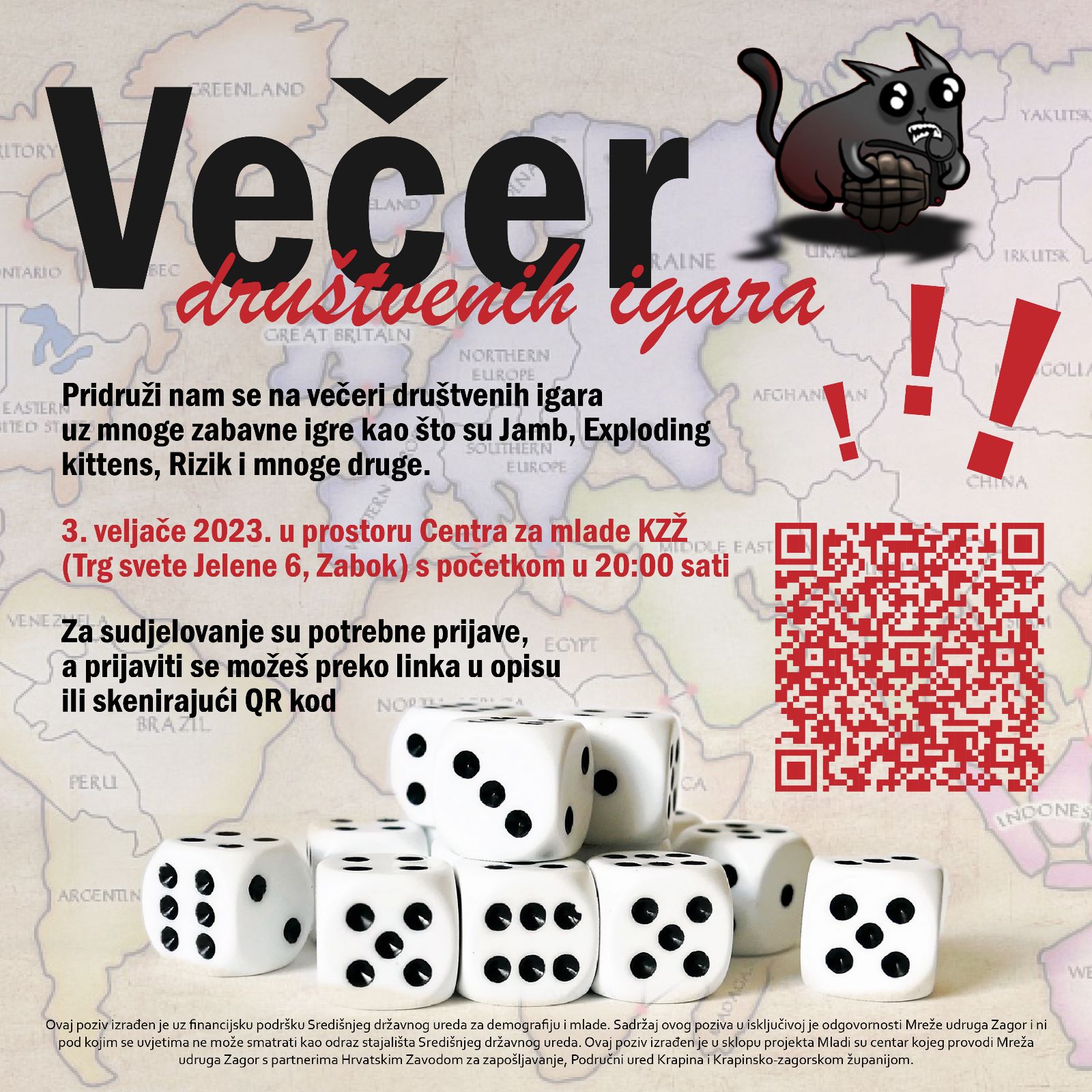 *Večer društvenih igara organizira se u sklopu projekta Mladi su centar kojeg provodi Mreža udruga Zagor s partnerima Hrvatskim zavodom za zapošljavanje, Područni ured Krapina i Krapinsko-zagorskom županijom. Projekt se provodi uz financiranje Središnjeg državnog ureda za demografiju i mlade.
