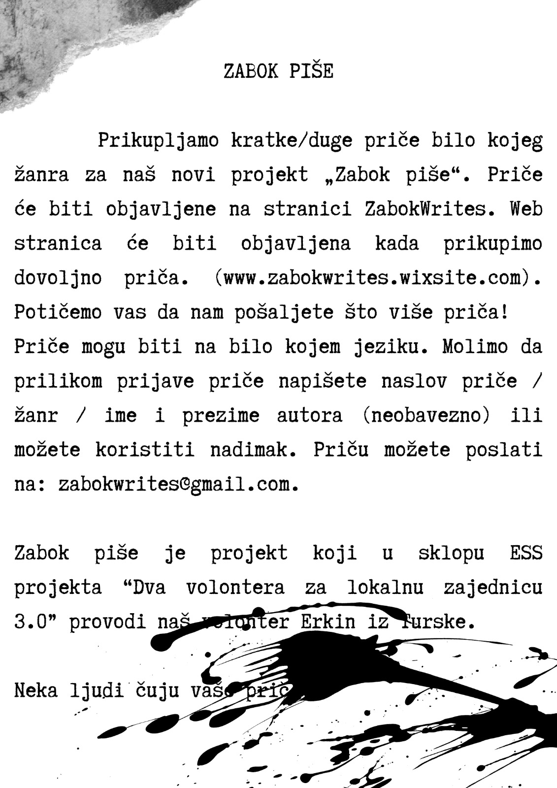 Potičemo vas da nam pošaljete što više priča! Priče mogu biti na bilo kojem jeziku. Molimo da prilikom prijave priče napišete naslov priče /žanr / ime i prezime autora (neobavezno) ili možete koristiti nadimak. Priču možete poslati na: zabokwrites@gmail.com. "Zabok piše" je aktivnost koju u sklopu ESS projekta “Dva volontera za lokalnu zajednicu 3.0” provodi naš volonter Erkin iz Turske.