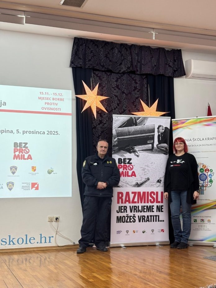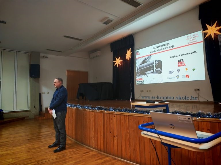 Završna konferencija "Mladi, alkohol i vožnja" projekta Bez promila održana je 5. prosinca 2025. godine u suradnji sa Srednjom školom Krapina. Okupljene je pozdravio ravnatelj škole Krunoslav Kranjčec, kao i Gordan Tramišak u ime Odbora za sigurnost cestovnog prometa Krapinsko-zagorske županije. Sudjelovali su i predstavnici Hrvatskog zavoda za javno zdravstvo Svetislav Joka, LAG-a Zagorje-Sutla Hrvoje Novak, Krapinsko-zagorske županije Kristina Franc te učenici i mentori iz Srednje škole Krapina, Škole za umjetnost, dizajn, grafiku i odjeću Zabok i Gimnazije A. G. Matoša Zabok. Prije početka konferencije podržao ju je i Miron Huljak iz Ravnateljstva policije Ministarstva unutarnjih poslova.