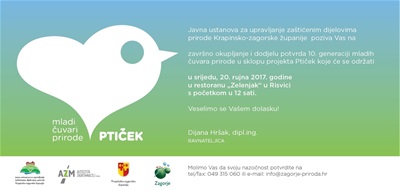 12.9.2017. // DogađanjaZavršno okupljanje i dodjela potvrda 10. generaciji mladih čuvara prirode u sklopu projekta ''Ptiček'' održati će se u srijedu, 20. rujna 2017. godine u restoranu „Zelenjak“ u Risvici s početkom u 12 sati.