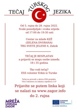 29.8.2022. //Dragi svi, od 5. rujna do 28. rujna 2022. godine, ponedjeljom i srijedom, od 17:00 do 19:30 sati održavat će se tečaj turskog jezika. Tečaj će se održavati u Centru za mlade KZŽ (Trg svete Jelene 6, Zabok).